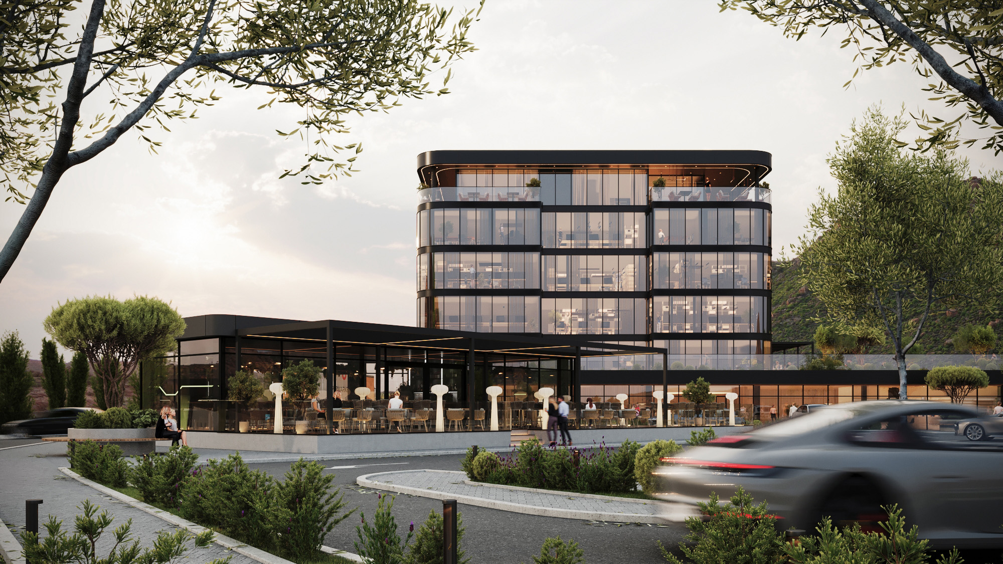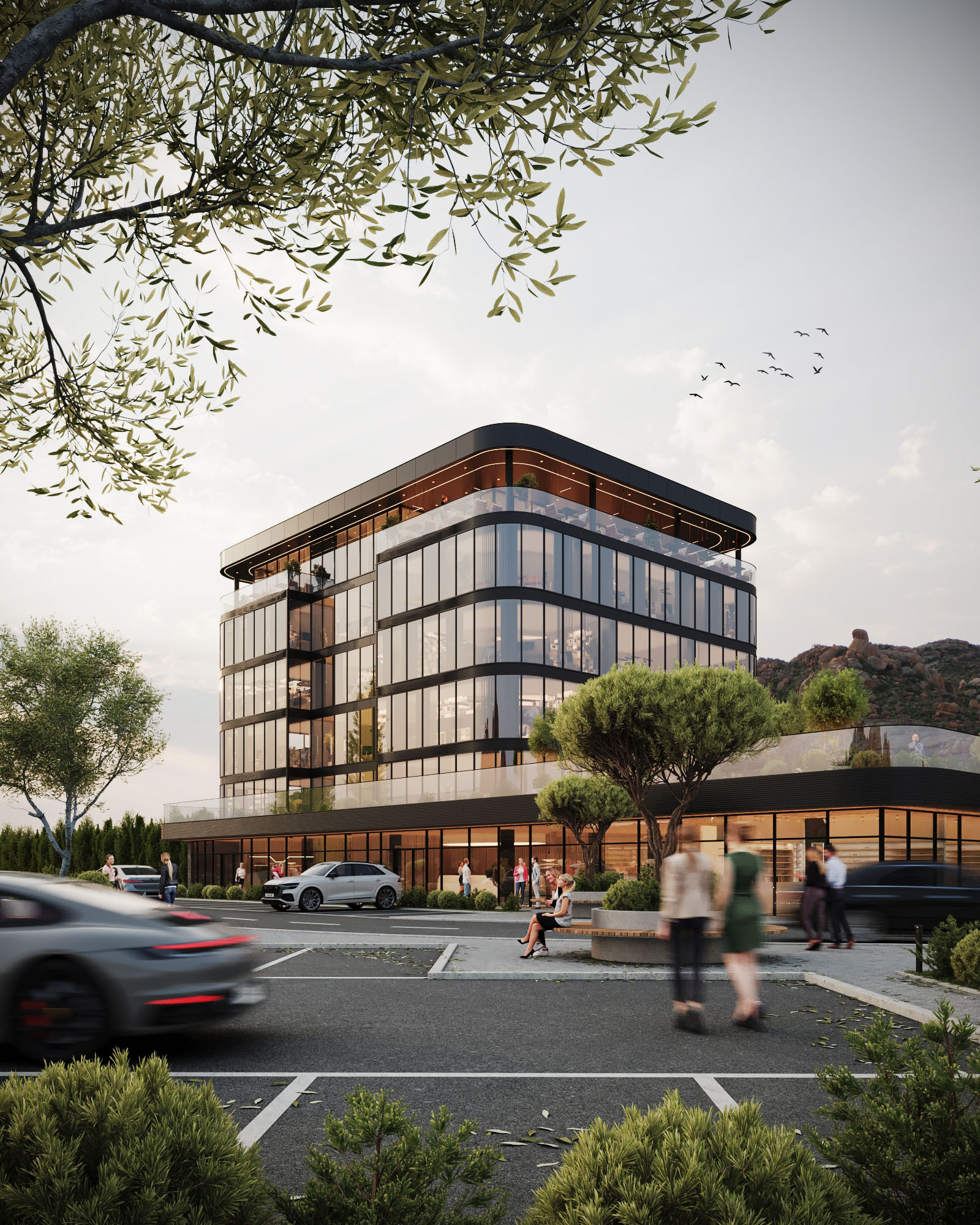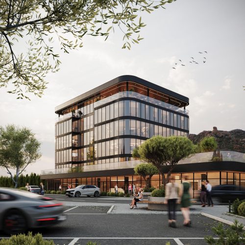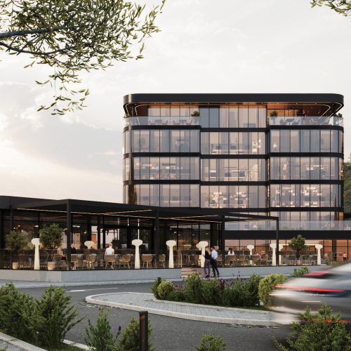 Za ovaj projekt kreirali smo fotorealistične 3D rendere eksterijera modernog poslovnog objekta, s naglaskom na čistu arhitektonsku liniju, prostrane staklene fasade i skladno uklopljeno hortikulturno uređenje.